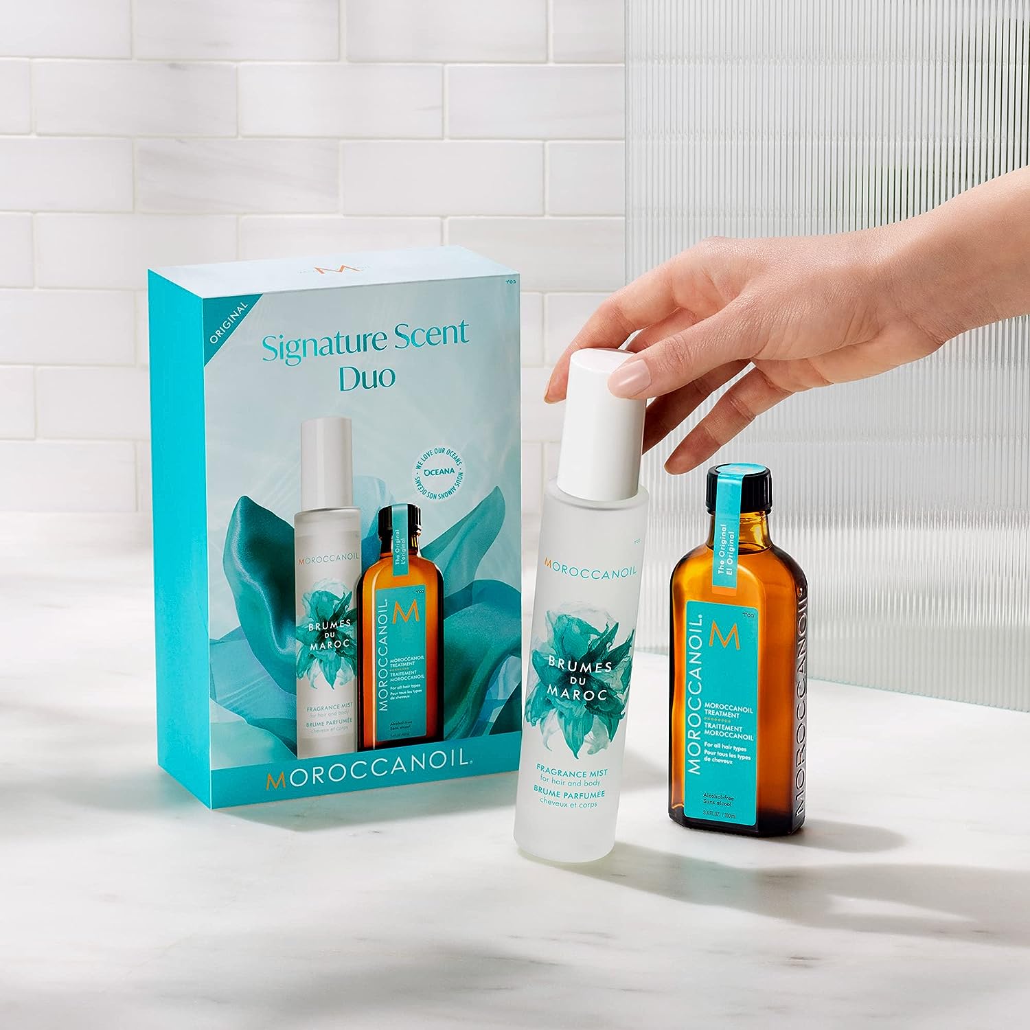 - Use Moroccanoil Treatment on damp or dry hair. Spritz on Hair & Body Fragrance Mist as desired throughout the day.